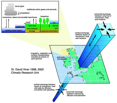 A schematic depiction of a the organization of a GCM; from IPCC, http://ipcc-data.org/guidelines/pages/gcm_guide.html)