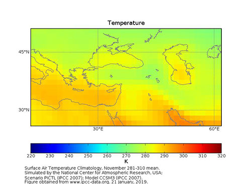 Sample output of GCM data for November mean surface air temperature in pre-industrial control period, ca. AD 281-310, model CCSM3; figure from www.ipcc-data.org, 21 Jan 2019
