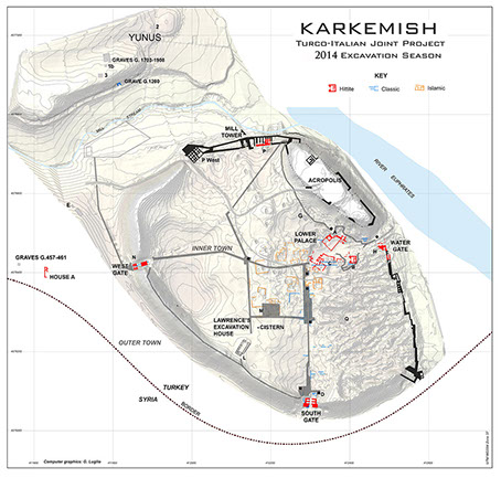 The site of Jerablus was identified by George Smith with ancient Karkemish in 1876. Between 1878 and 1881 the British consul in Aleppo P. Henderson carried out some soundings at the site and shipped some sculptures to the British Museum in London who organized at the site large scale excavations between 1911 and 1914 and again in 1920. The excavations were led by D.G. Hogarth, T.E. Lawrence, R. Campbell-Thompson, P.L.O. Guy and the famous Leonard. Woolley (director). The ruins of their Expedition House – built by Lawrence (of Arabia) in the first campaign – are still well visible in the inner town and many pictures document their daily life.